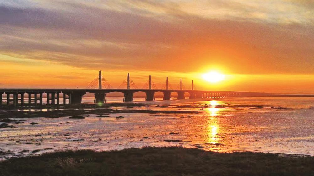 冬日的烏海湖上,大橋在落日余暉中勾勒出清晰剪影,金色霞光透過橋身鋪灑在冰封的湖面,光與影交織間,一幅壯闊的塞上冬日日落圖景鋪展眼前。(趙政宇 攝)